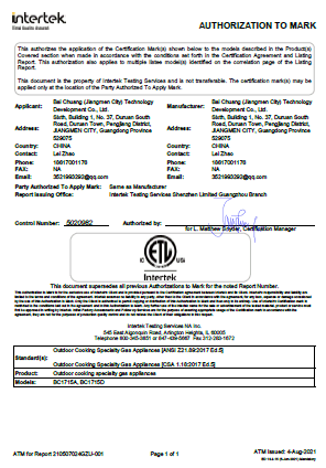 Baichuang (Jiangmen) Technology Development Co., Ltd is a factory dedicated in research and production of outdoor hardware product,it mainly covers Gas grill,Gas oven,carbon grill,heating stove”good quality,easy to use’is our aim for customer.